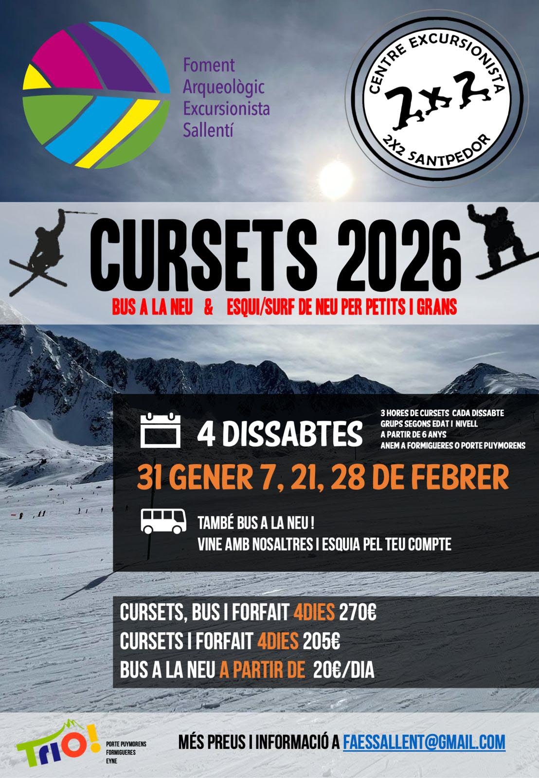 | Descripció | Enguany (any 2026), organitzem 4 dissabtes : 31 de Gener. 7, 21 i 28 de Febrer.- Per participar als cursets, cal ser soci del 2x2 o de l'entitat Foment Arqueològic Excursionista Sallentí. - L'Edat mínima per participar als cursets és de 6 anys ( fets ). - Els participants s’organitzaran, ja sigui per edat o per nivell d’esquí/surf de neu, en grups acompanyats per un responsable que desenvolupa un tasca d’acompanyament per les pistes d’esquí, i de guiatge en l’aprenentatge de la modalitat d’esquí alpí o surf de neu. - Els 2 primers dissabtes ( 31 de Gener i 7 de Febrer ), un dels grups d'esquí/surf de neu serà de debutants. - Si l’activitat o el nombre de persones acompanyants ho requereix, és demanarà un mínim de participants per tal de formar un grup. Pensem sobretot en la modalitat de surf de neu. - Els horaris dels cursets són de 10 a 13h. De 13 a 16h, els cursetistes no estan sota la supervisió dels acompanyants. - Els cursets es duen a terme en una de les tres estacions del grup TRIO ( https://www.trio-pyrenees.com/es/ ). - Cada setmana informarem quina serà la destinació escollida pel dissabte de cursets. Això sí, el darrer dia serà a Formigueres ja que volem coincidir sempre amb el Memorial pel Marc i el Josep Maria que s’organitza des de la pròpia entitat. - Segons les condicions meteorològiques, triarem entre alguna de les tres estacions del grup Trio, ara bé, com a Foment Arqueològic Excursionista Sallentí , prioritzem esquiar a Formigueres. |
